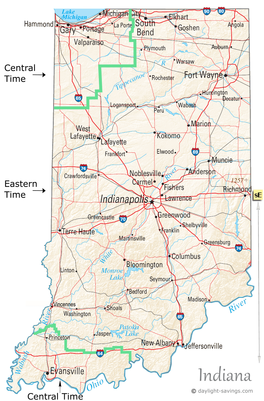 | Most of Indiana is in the Eastern Time Zone: Indianapolis, Fort Wayne... except for 12 of its 92 counties, which are in the Central Time Zone. | |