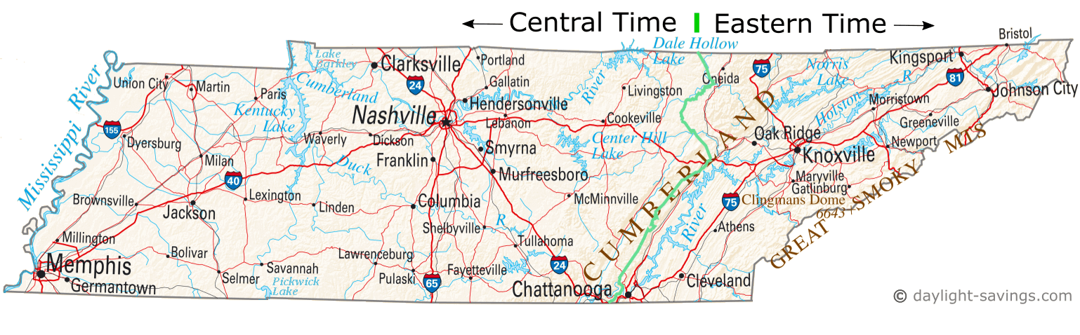| Map of Tennessee time zones with cities and roads |